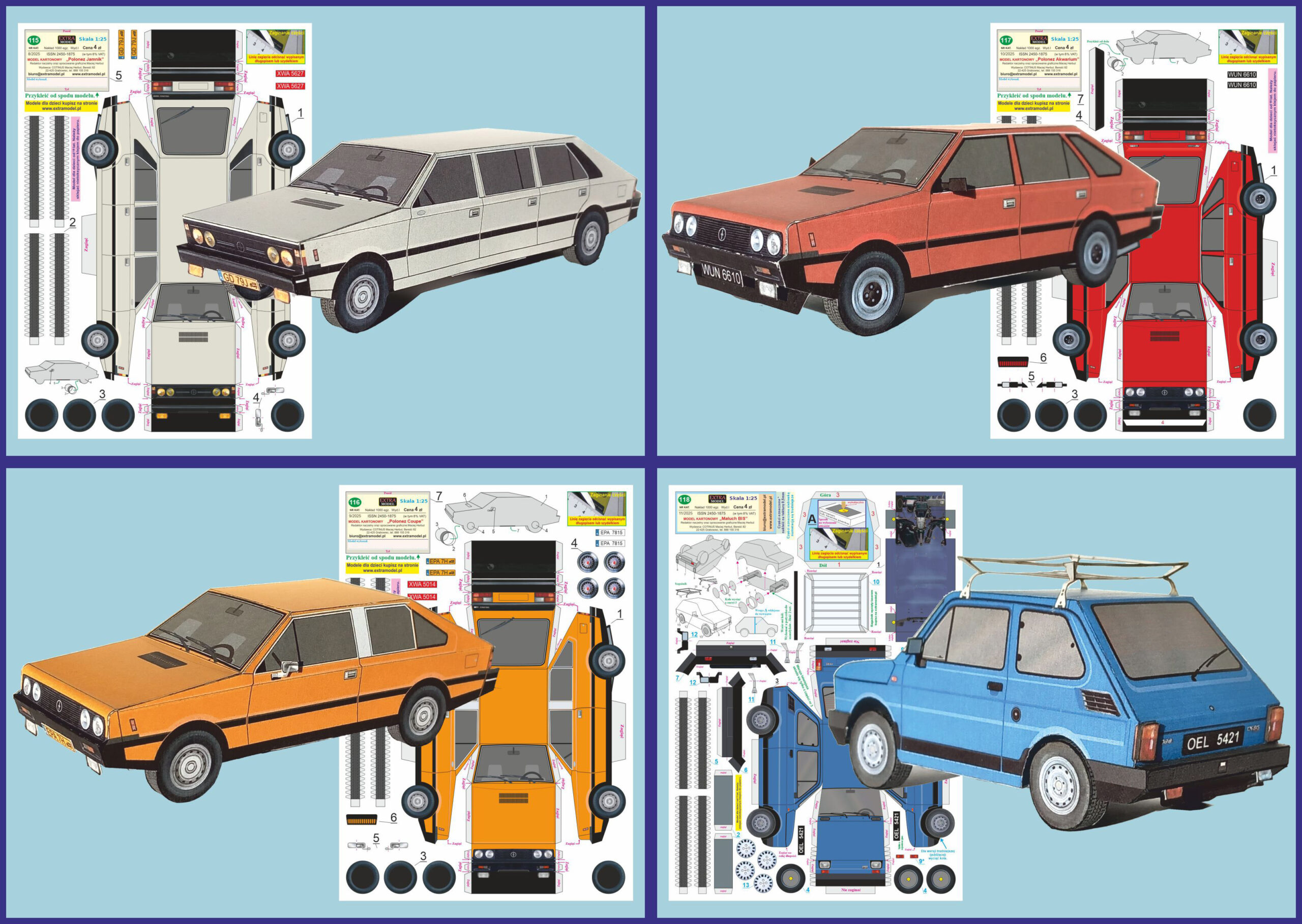 Wydawnictwo Extra Model z początkiem nowego roku przygotowało dla najmłodszych modelarzy kartonowych aż cztery modele samochodów w skali 1:25: Polonez Coupe, Polonez Jamnik, Polonez Akwarium oraz Maluch Bis.
